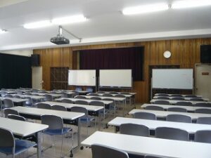 約120名を収容できる教室には、鉱物資料などが数多く置かれており、手に取って学ぶことができます。また地学の講習等でも使用される多用途の教室です。